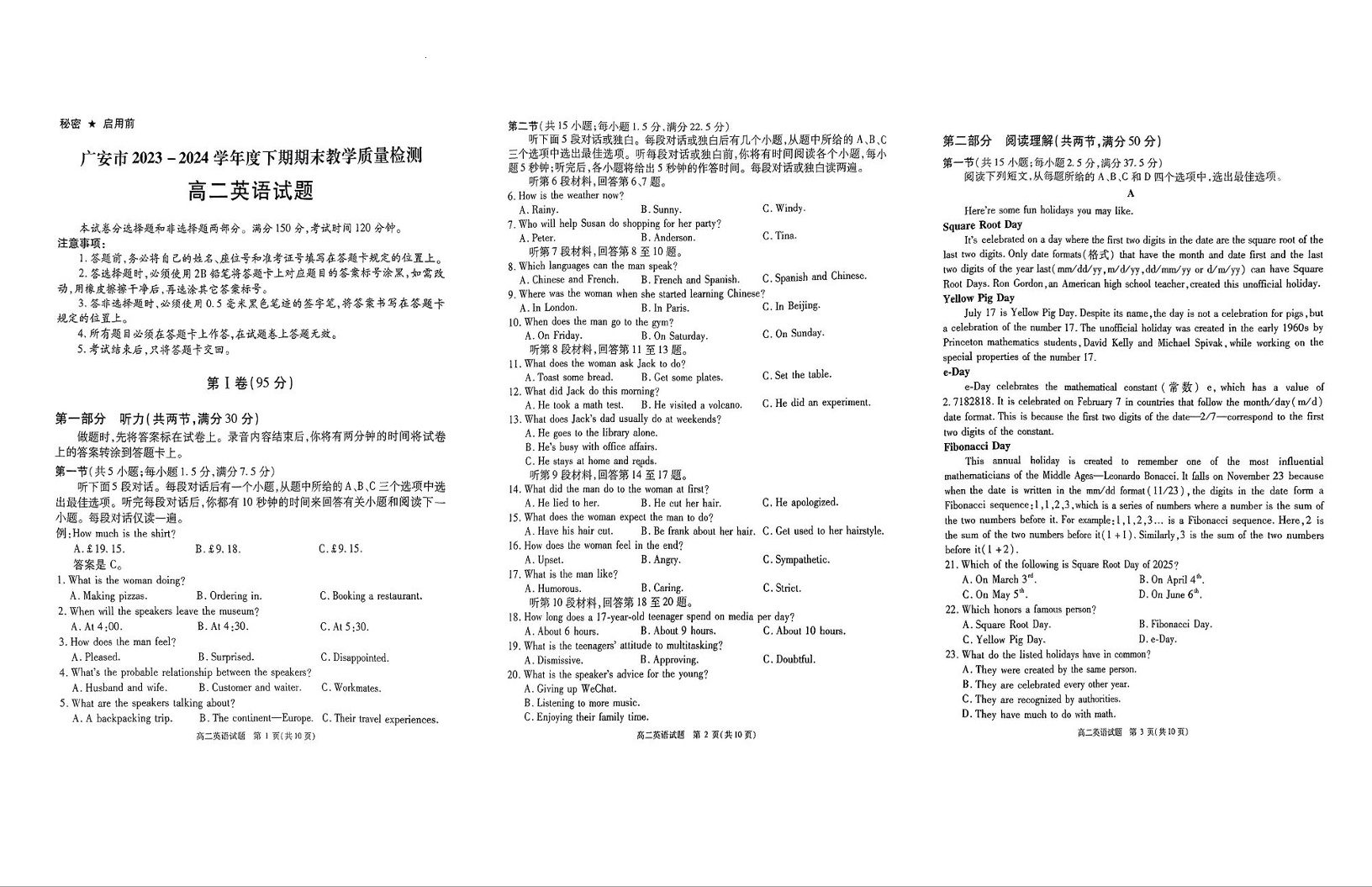四川省九市高2025届第二学期期期末质量检测联考英语