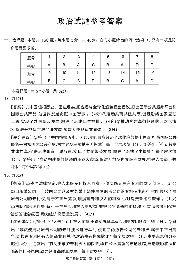 四川省九市高2025届第二学期期期末质量检测联考政治答案