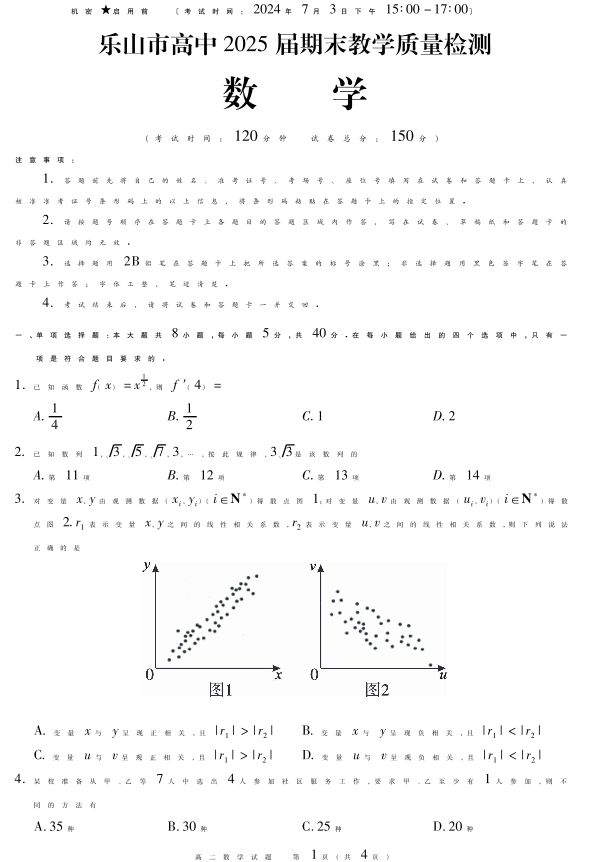四川省乐山市高2025届下学期期末教学质量检测数学