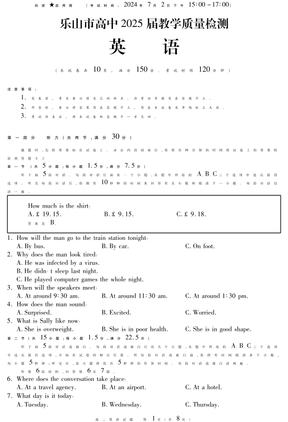 四川省乐山市高2025届下学期期末教学质量检测英语
