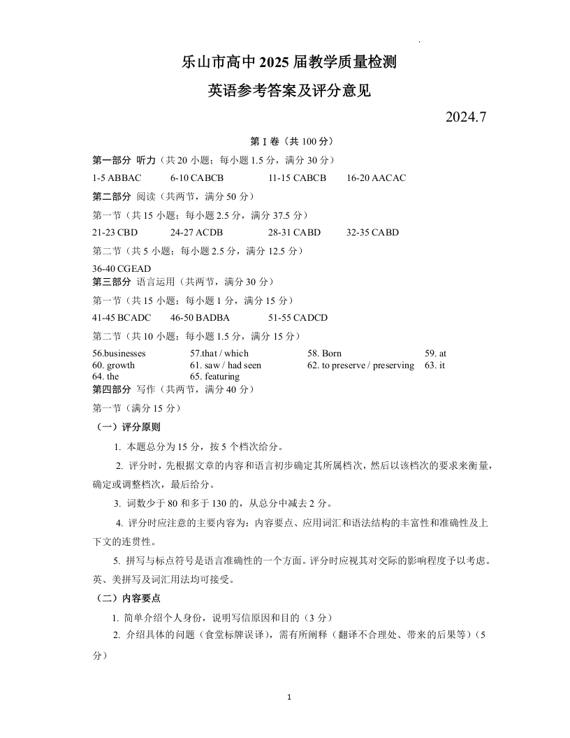 四川省乐山市高2025届下学期期末教学质量检测英语答案