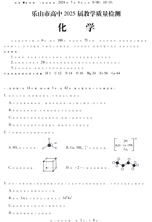 四川省乐山市高2025届下学期期末教学质量检测化学