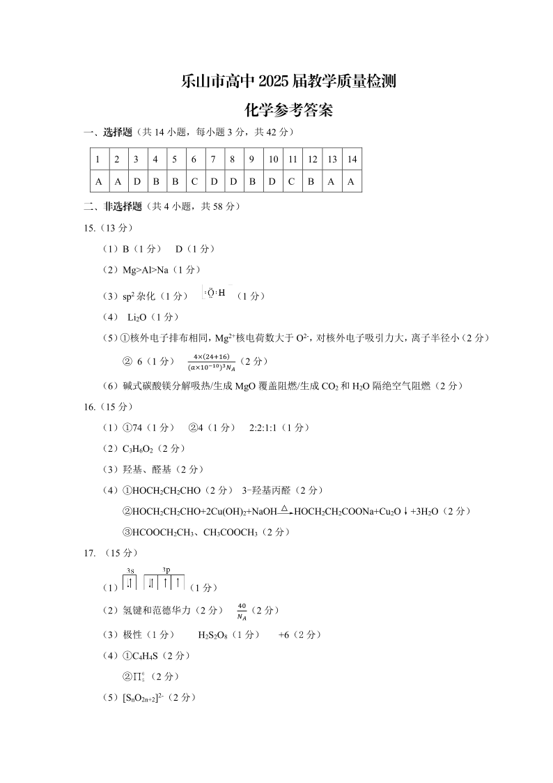 四川省乐山市高2025届下学期期末教学质量检测化学答案