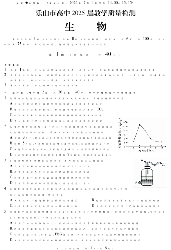 四川省乐山市高2025届下学期期末教学质量检测生物