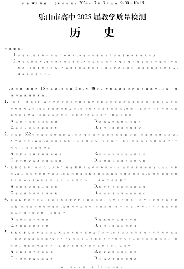 四川省乐山市高2025届下学期期末教学质量检测历史