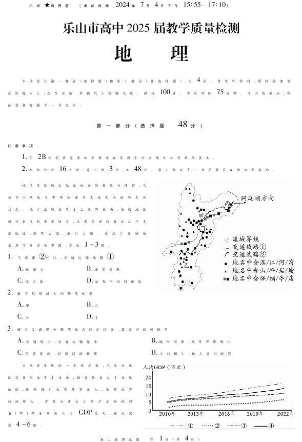 四川省乐山市高2025届下学期期末教学质量检测地理