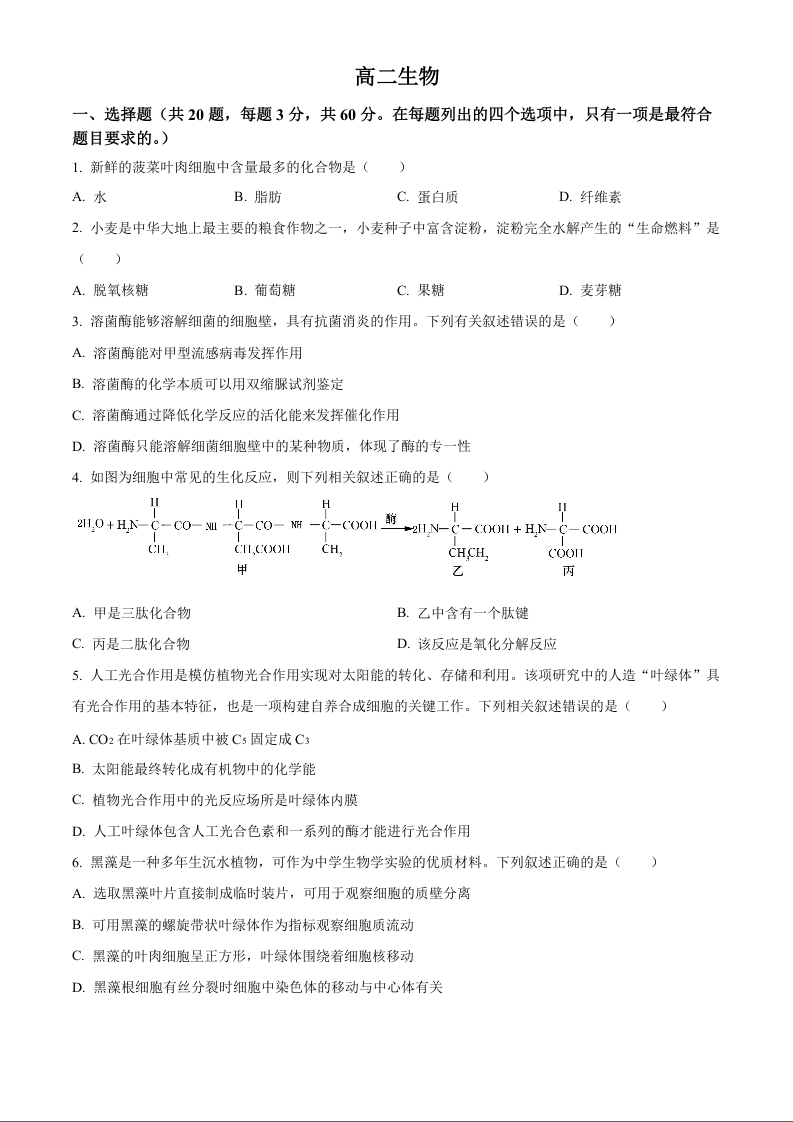 天津市红桥区高2025届下学期7月期末考试生物+答案