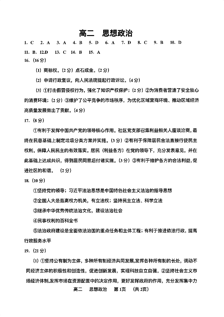 天津市红桥区高2025届下学期7月期末考试政治答案