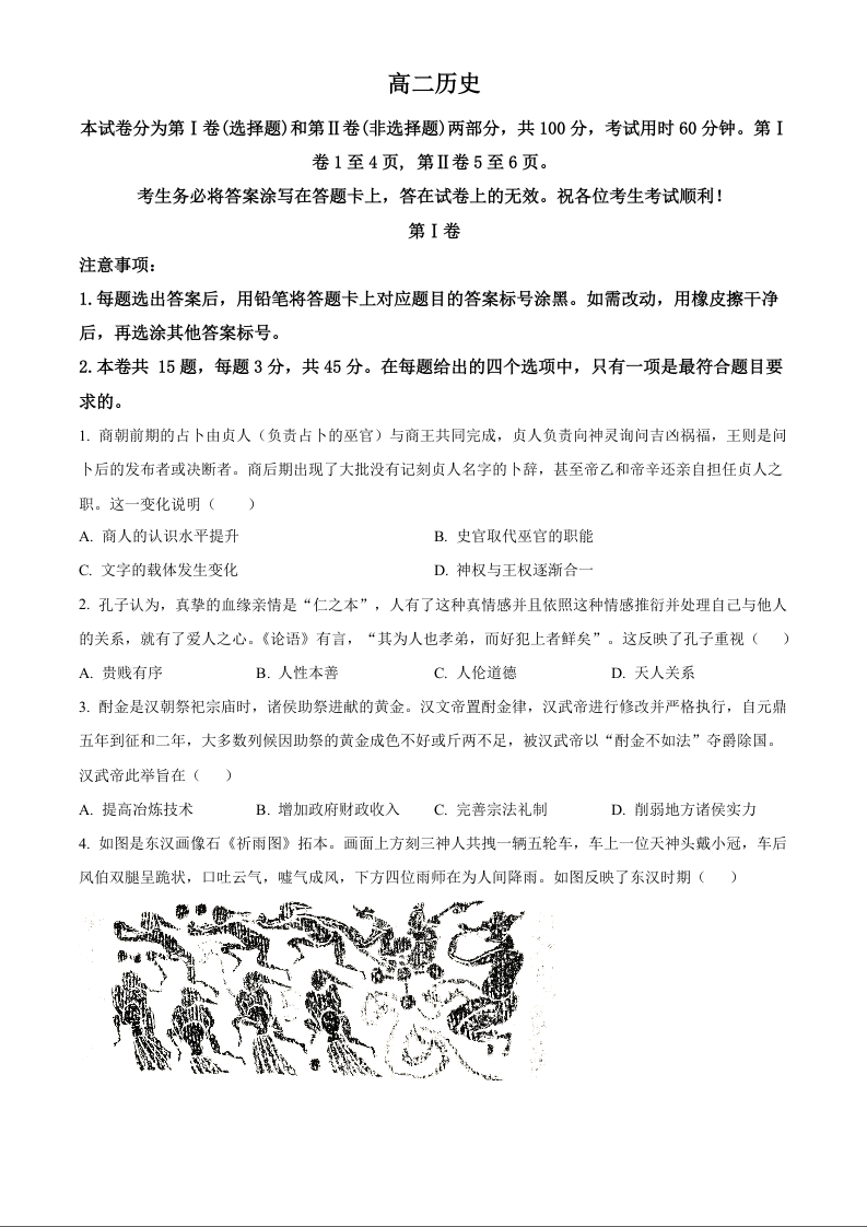天津市红桥区高2025届下学期7月期末考试历史+答案