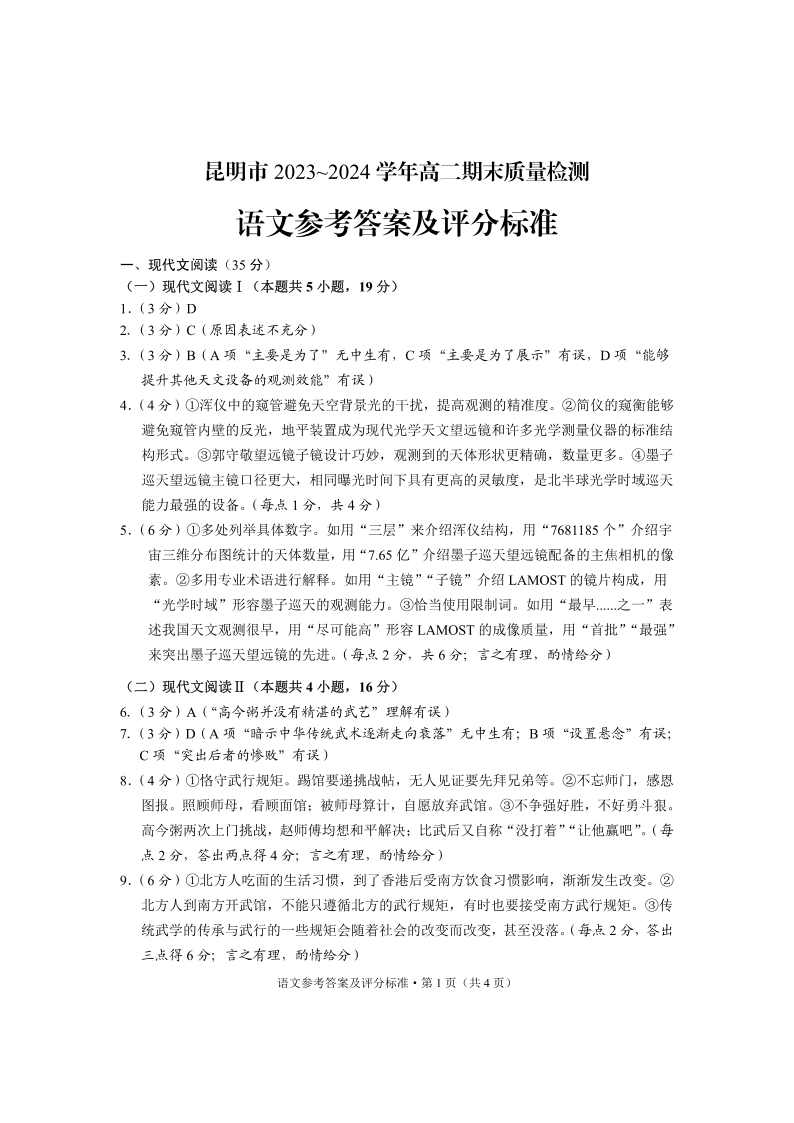 云南省昆明市高2025届下学期期末质量检测考试语文答案