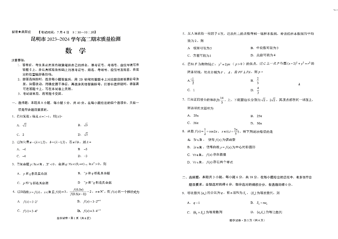 云南省昆明市高2025届下学期期末质量检测考试数学