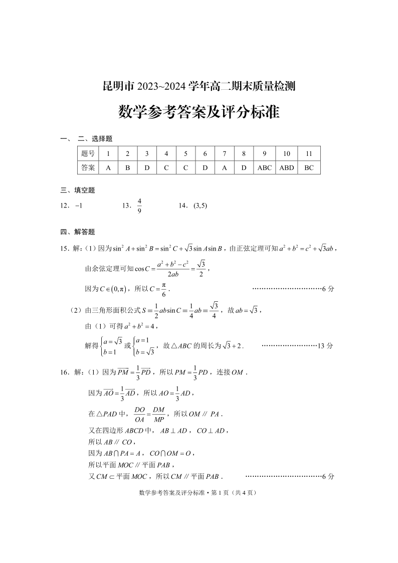 云南省昆明市高2025届下学期期末质量检测考试数学答案