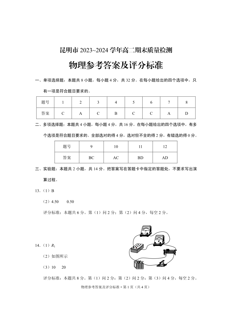 云南省昆明市高2025届下学期期末质量检测考试物理答案