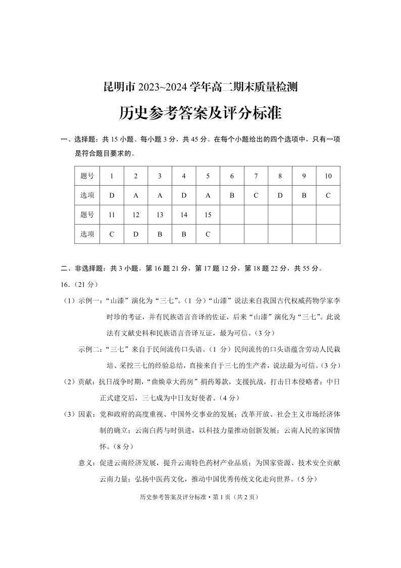 云南省昆明市高2025届下学期期末质量检测考试历史答案