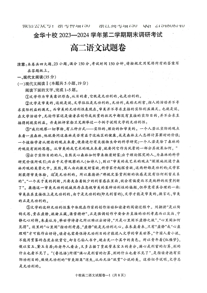 浙江省金华十校高2025届学期高二期末调研考试语文