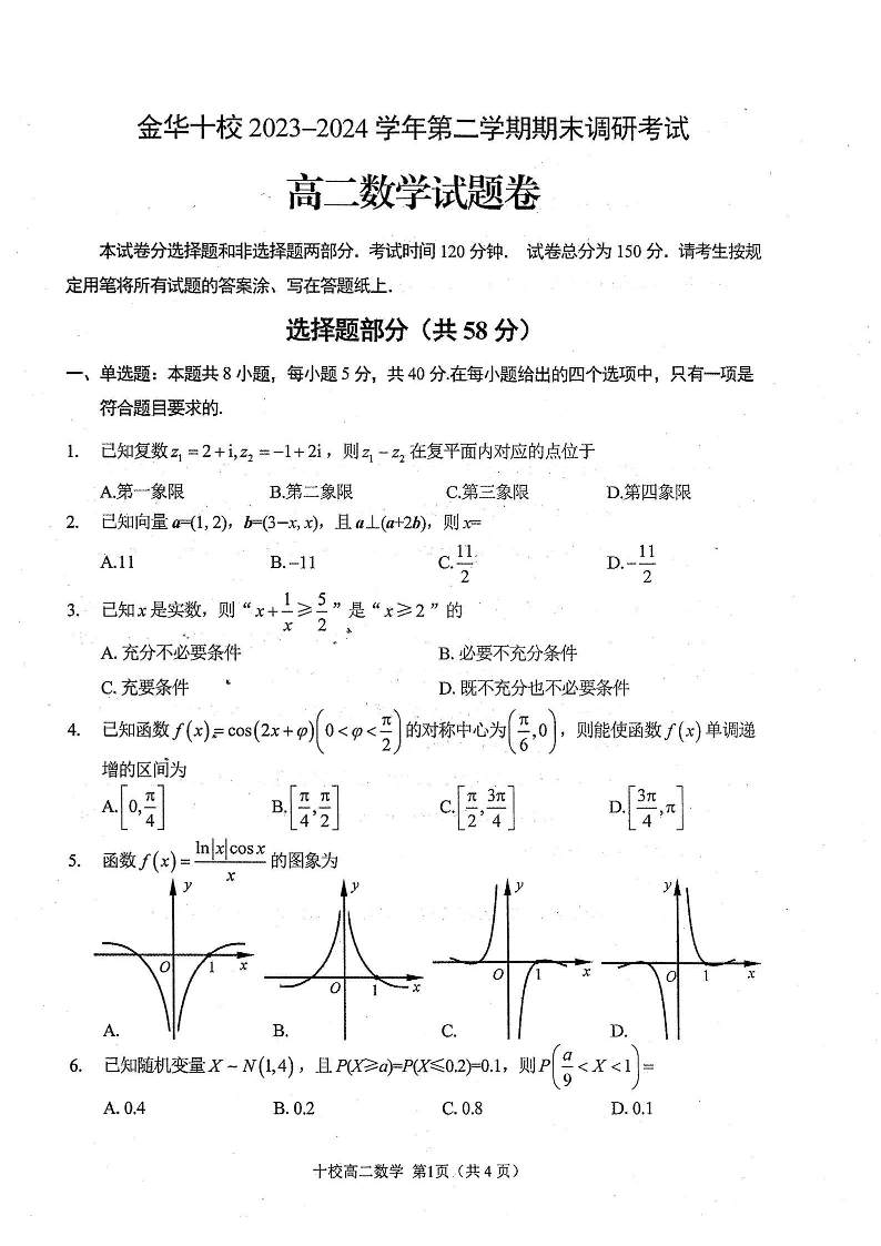 浙江省金华十校高2025届学期高二期末调研考试数学