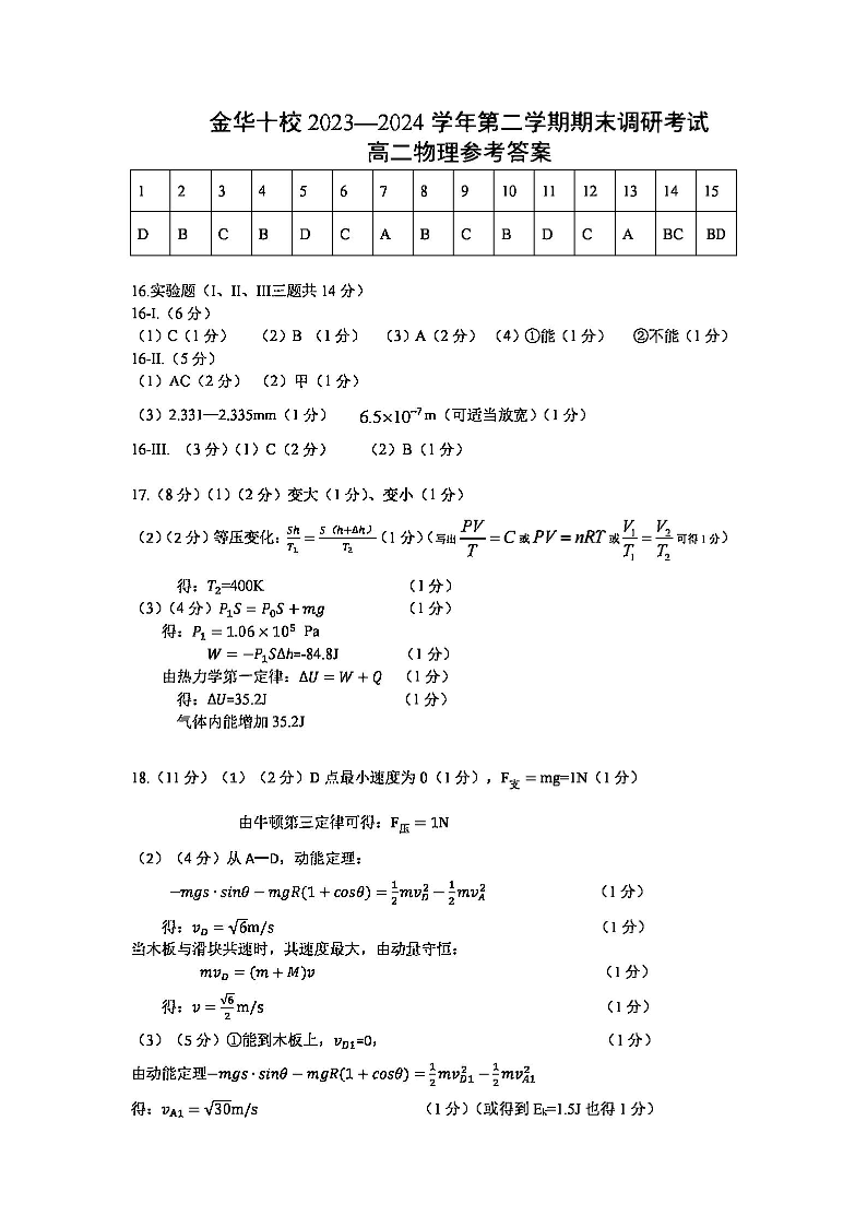 浙江省金华十校高2025届学期高二期末调研考试物理答案
