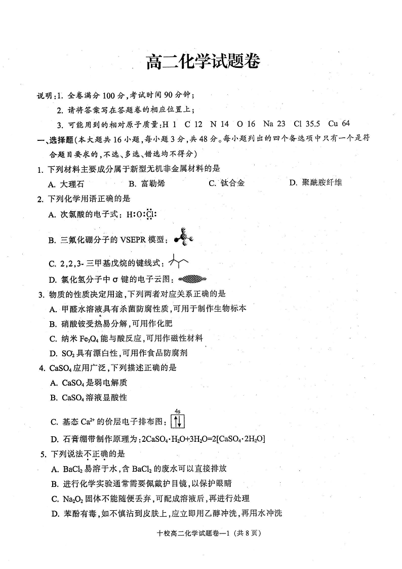 浙江省金华十校高2025届学期高二期末调研考试化学