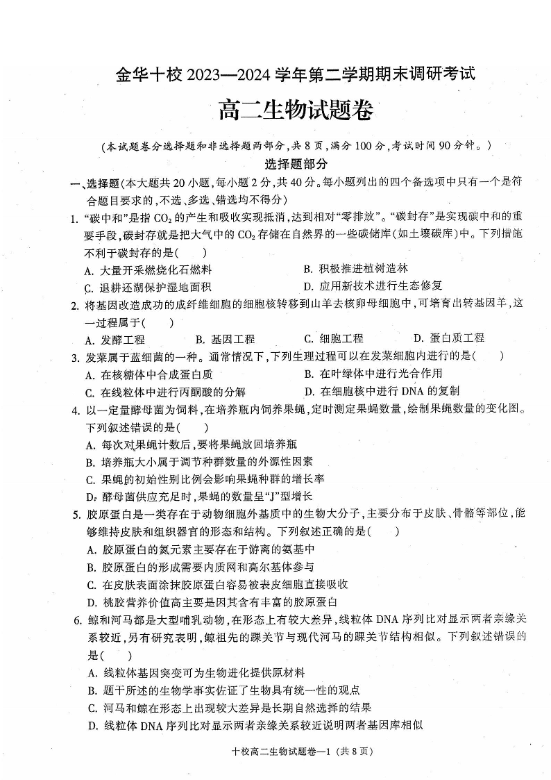 浙江省金华十校高2025届学期高二期末调研考试生物