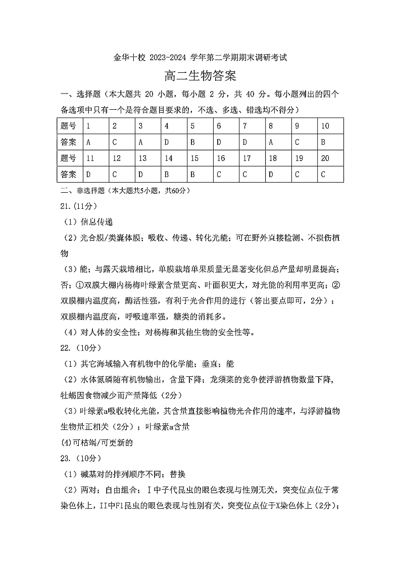浙江省金华十校高2025届学期高二期末调研考试生物答案