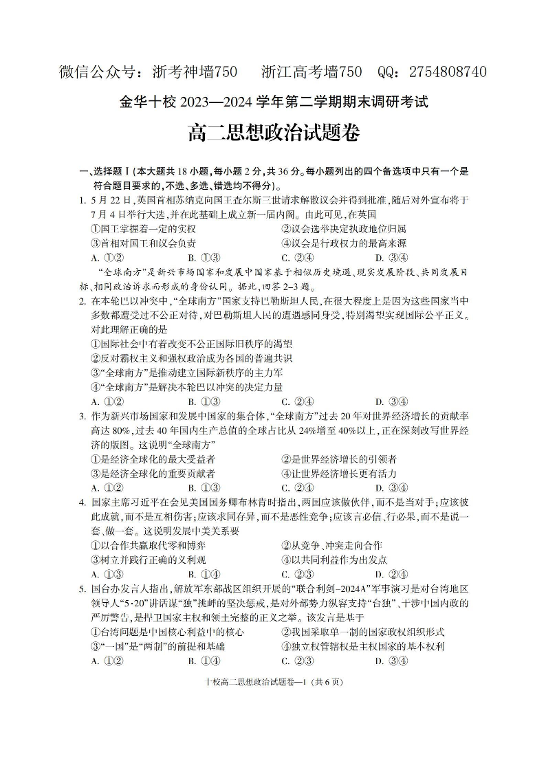 浙江省金华十校高2025届学期高二期末调研考试政治