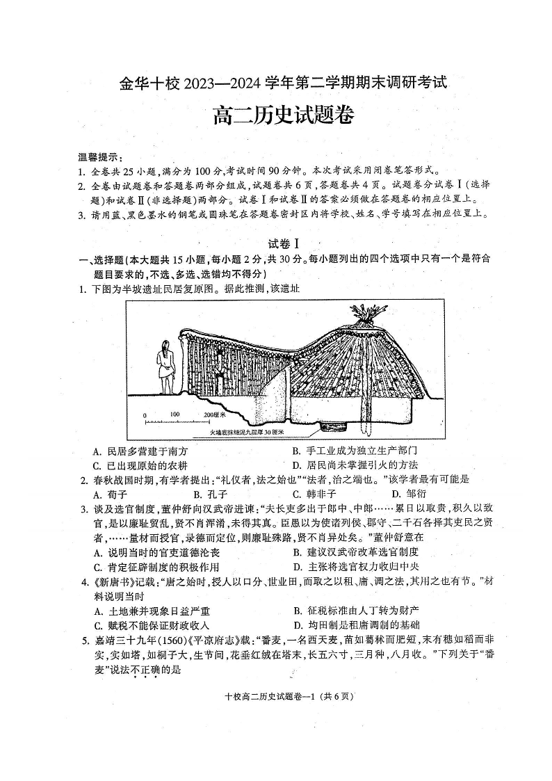 浙江省金华十校高2025届学期高二期末调研考试历史