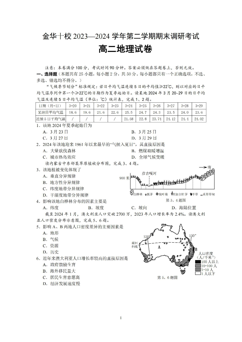浙江省金华十校高2025届学期高二期末调研考试地理