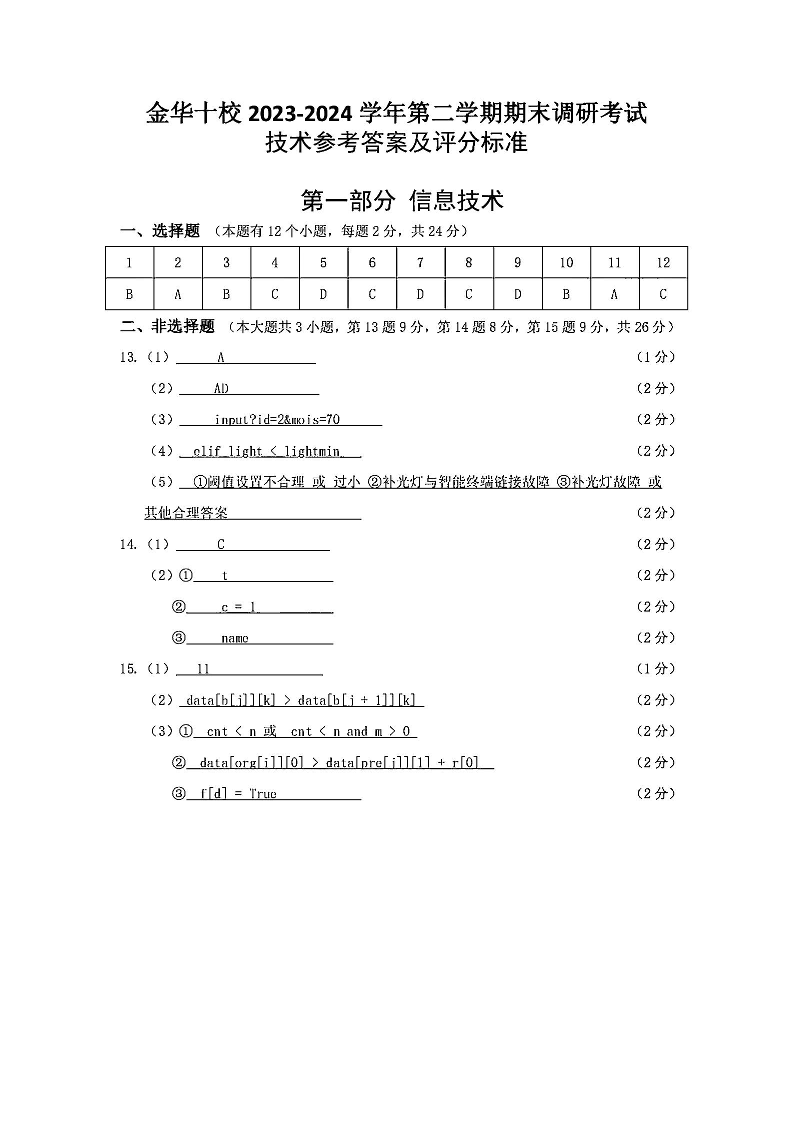 浙江省金华十校高2025届学期高二期末调研考试技术答案