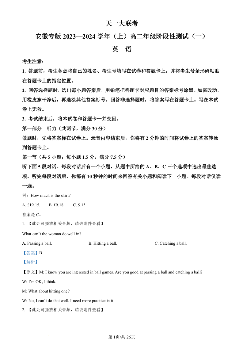 安徽省部分学校2023-2024学年高二10月联考英语(精品解析版)