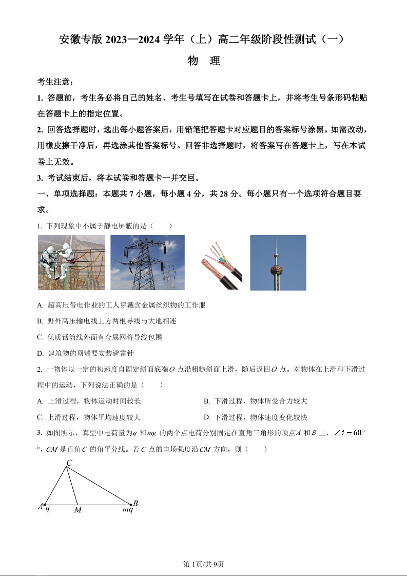 安徽省部分学校2023-2024学年高二10月联考物理+答案