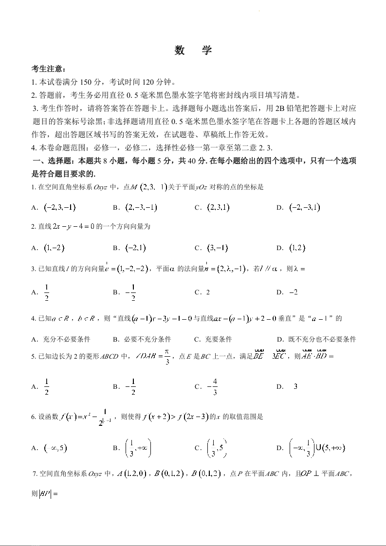 安徽省名校2023-2024学年高二上学期10月月考数学
