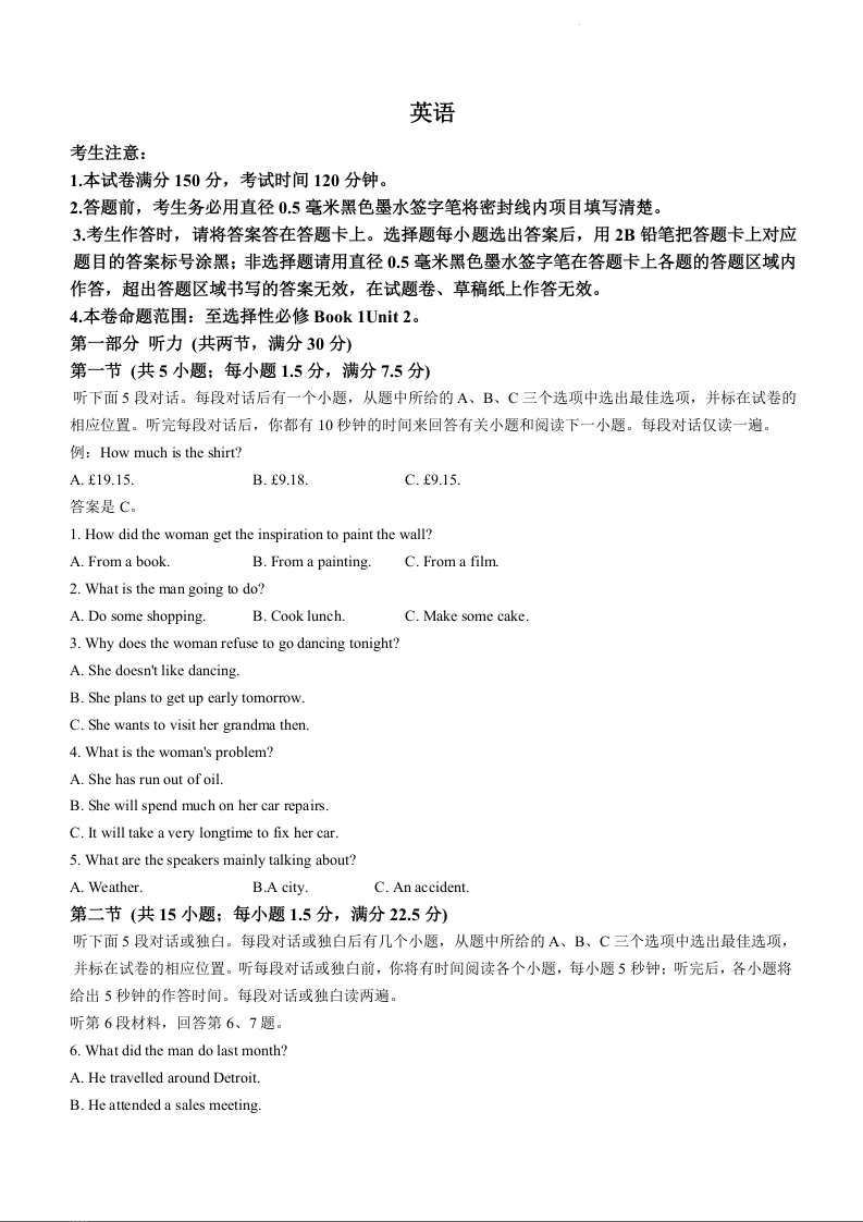 安徽省名校2023-2024学年高二上学期10月月考英语