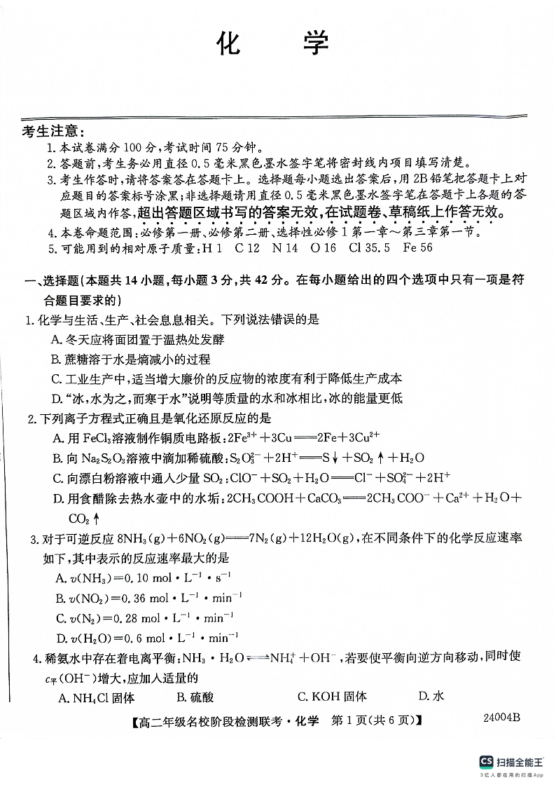 安徽省名校2023-2024学年高二上学期10月月考化学