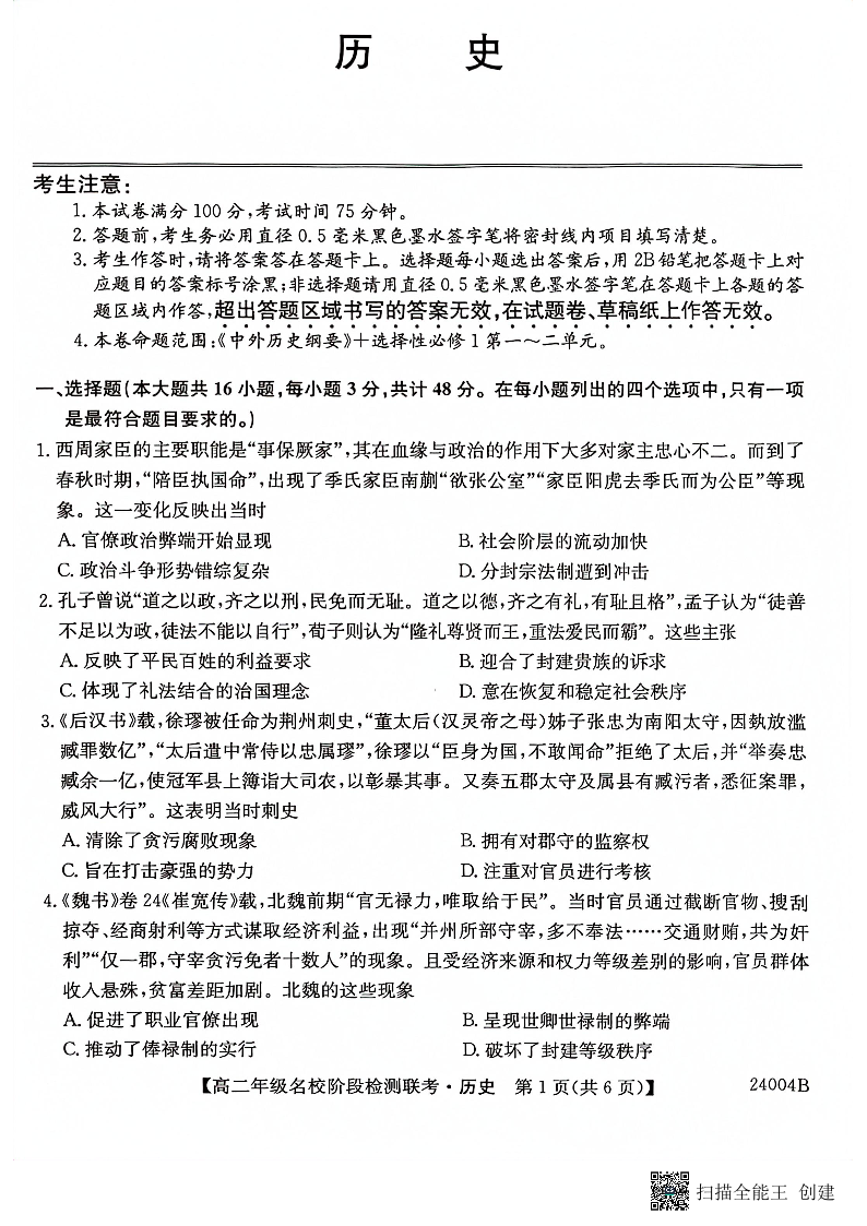 安徽省名校2023-2024学年高二上学期10月月考历史+答案