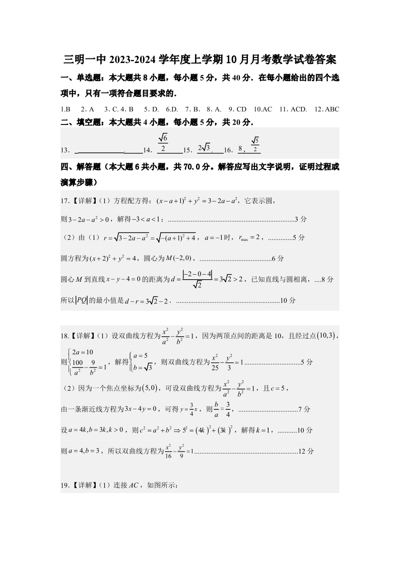 福建省三明第一中学2023-2024学年高二上学期10月月考数学答案