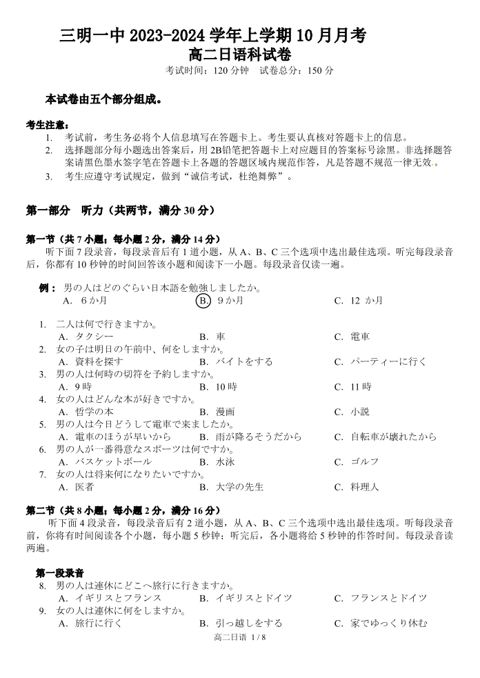 福建省三明第一中学2023-2024学年高二上学期10月月考日语