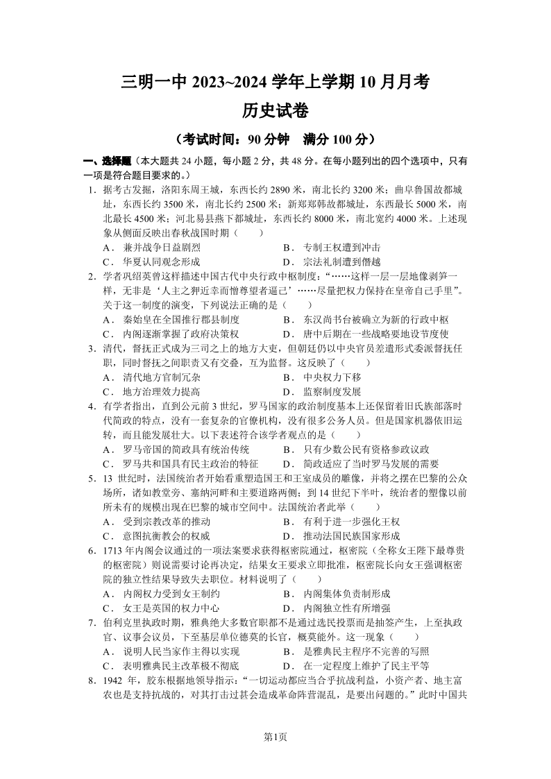 福建省三明第一中学2023-2024学年高二上学期10月月考历史