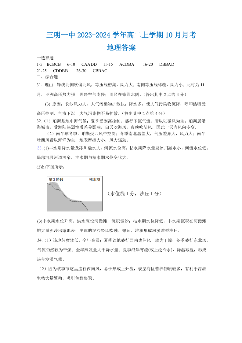福建省三明第一中学2023-2024学年高二上学期10月月考地理答案