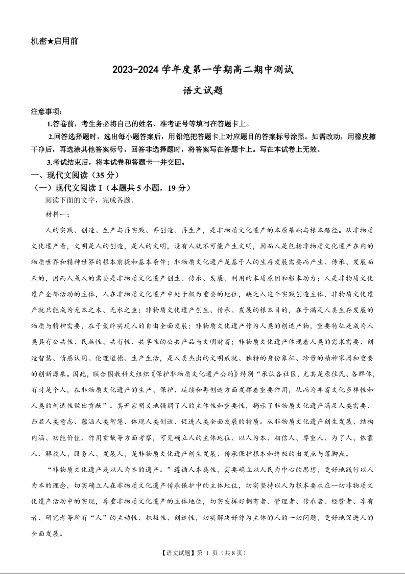 广东省阳江市2023-2024学年高二上学期10月期中考试试题语文+答案
