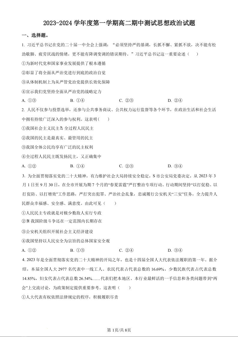 广东省阳江市2023-2024学年高二上学期10月期中考试试题政治(原卷版)