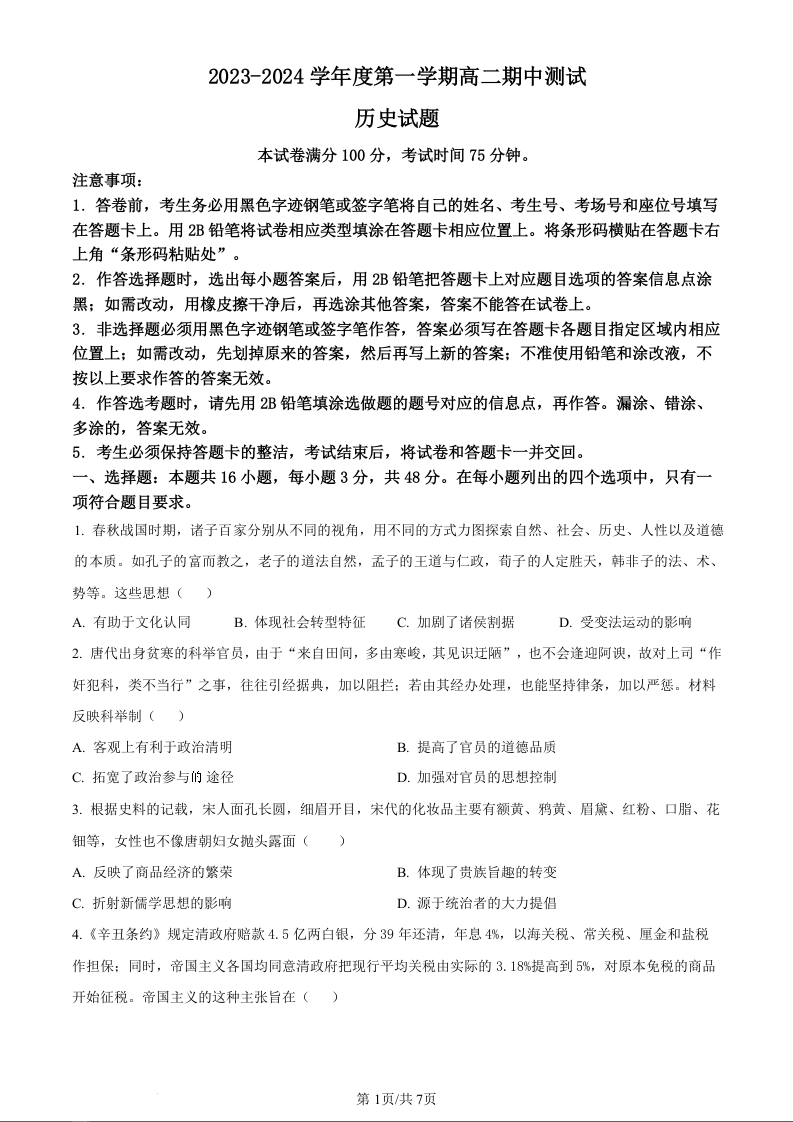 广东省阳江市2023-2024学年高二上学期10月期中考试试题历史(原卷版)