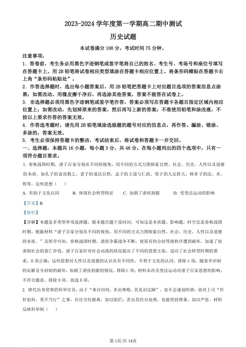 广东省阳江市2023-2024学年高二上学期10月期中考试试题历史(精品解析版)