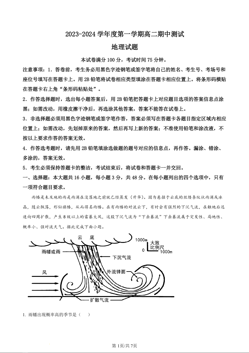 广东省阳江市2023-2024学年高二上学期10月期中考试试题地理试题(原卷版)