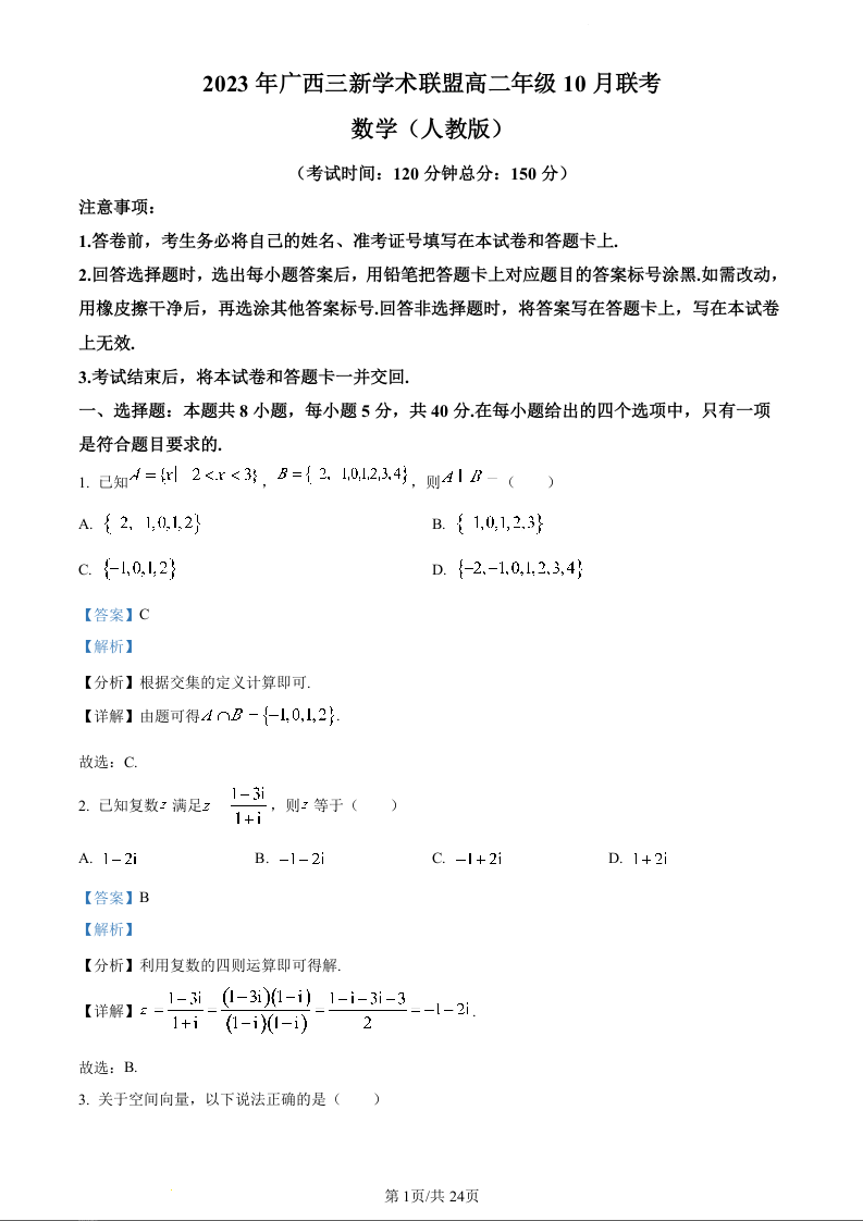 广西三新学术联盟2023-2024学年高二年级10月联考数学(精品解析版)