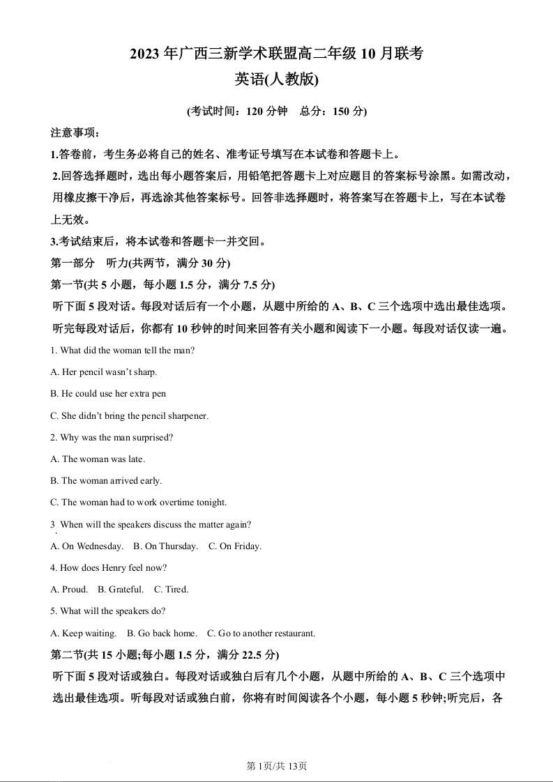 广西三新学术联盟2023-2024学年高二年级10月联考英语试题(原卷版)