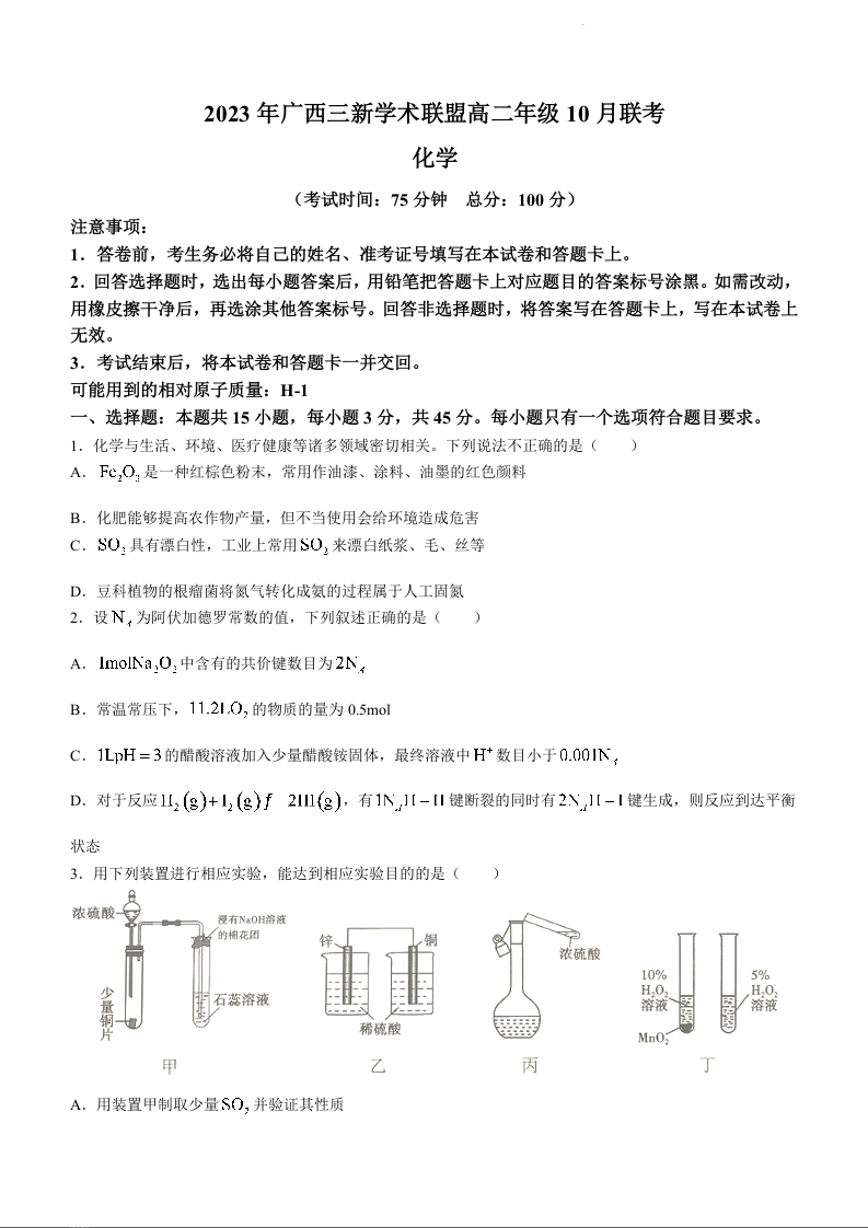 广西三新学术联盟2023-2024学年高二年级10月联考化学
