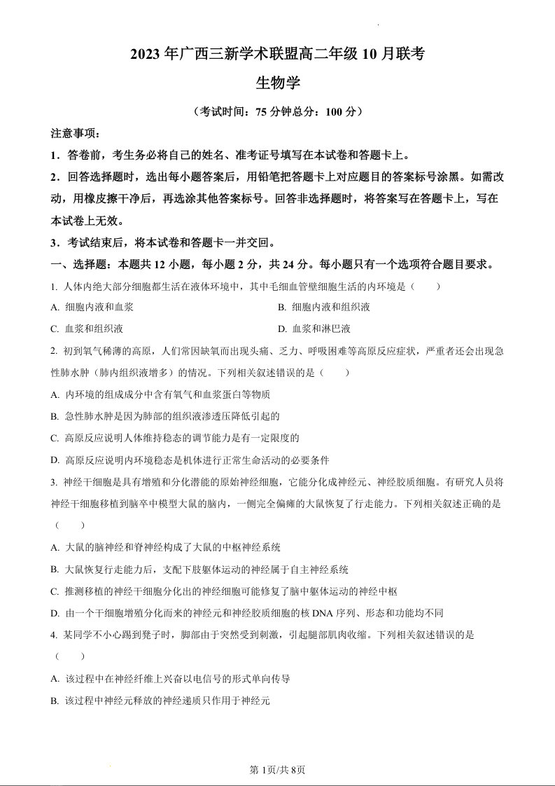 广西三新学术联盟2023-2024学年高二年级10月联考生物(原卷版)