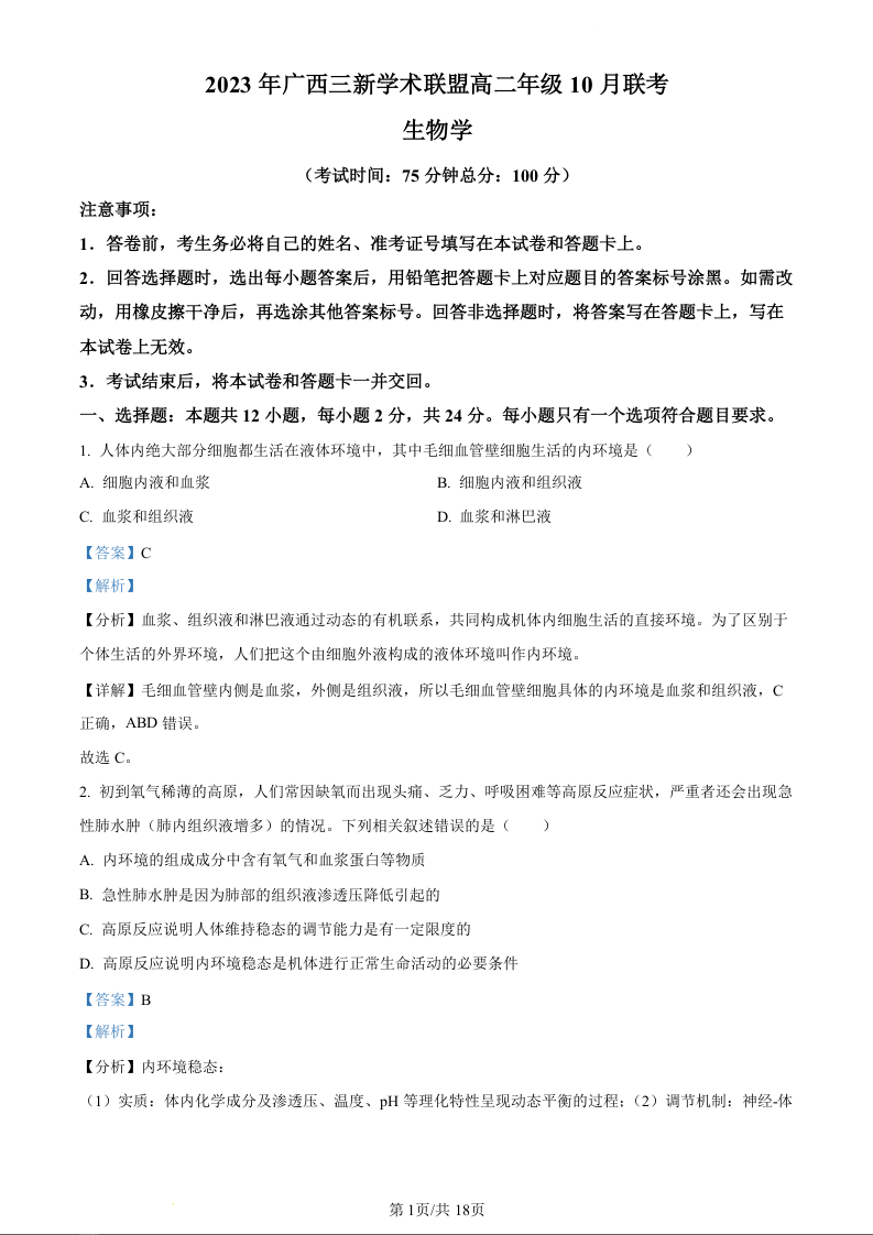 广西三新学术联盟2023-2024学年高二年级10月联考生物(精品解析版)