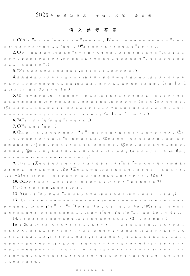 广西壮族自治区河池市八校联考2023-2024学年高二上学期10月月考语文答案