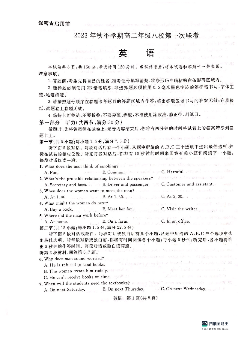 广西壮族自治区河池市八校联考2023-2024学年高二上学期10月月考英语